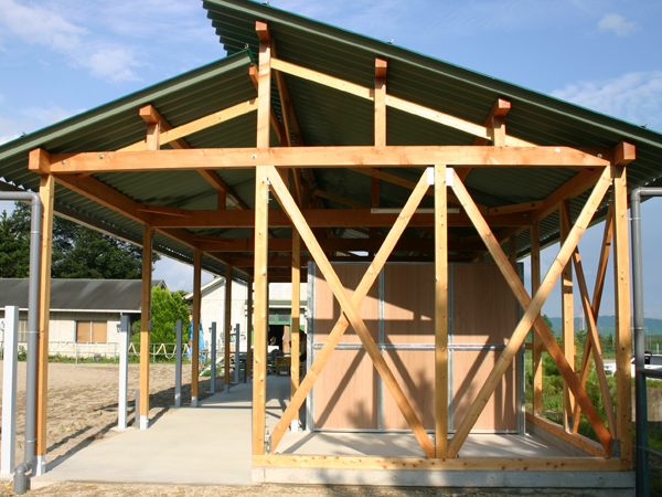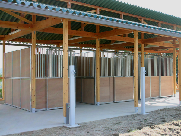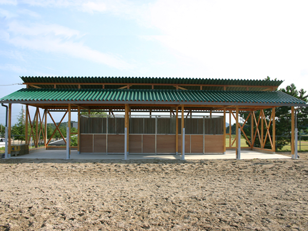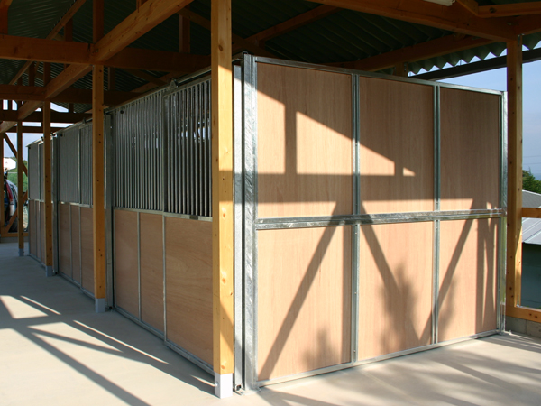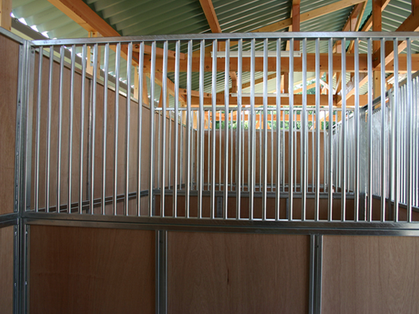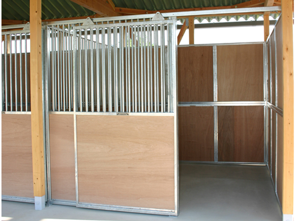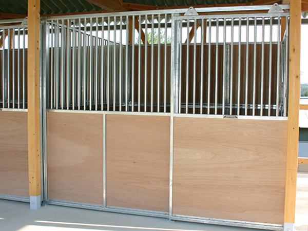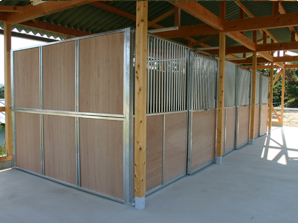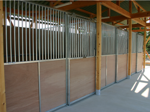 馬房パーティションを4面(前面/間仕切り/背面/側面)採用したケースです。厩舎の壁は一切建築で作っていません。腰板はベニヤ24t仕様。