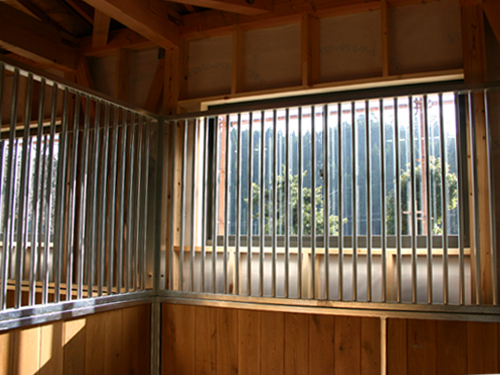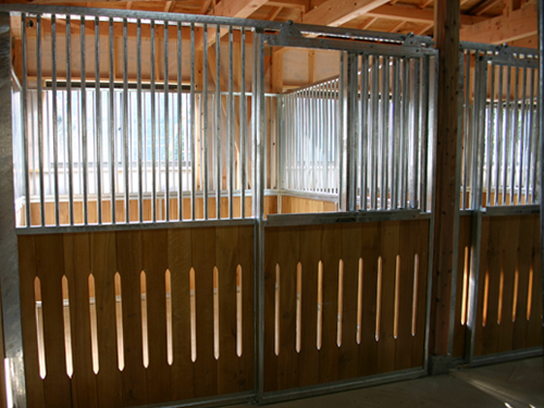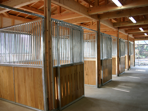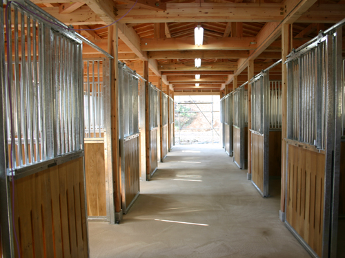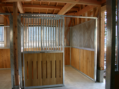 馬房パーティションを4面(前面/間仕切り/背面/側面)採用したケースです。背面Pの採用で建築の内壁は特に補強する必要がありません。