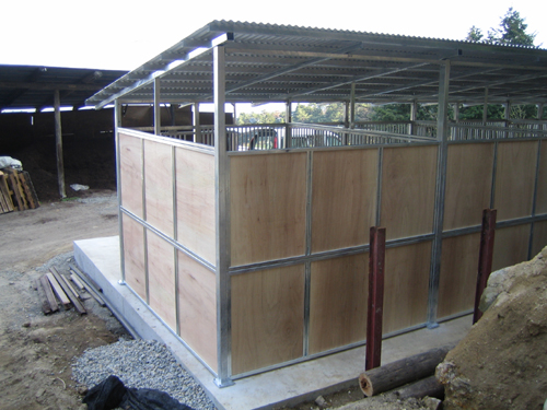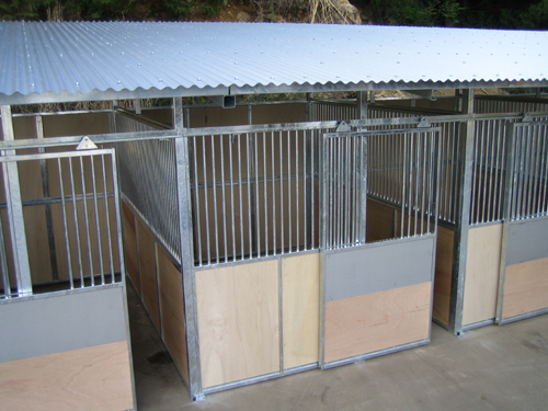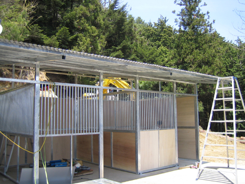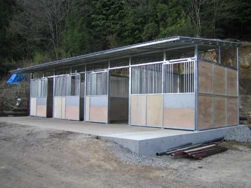 馬房パーティションを4面(前面/間仕切り/背面/側面)採用したケースです。厩舎の壁は一切建築で作っていません。腰板はベニヤ24t仕様。 屋根の傾斜はご希望により通常と反対に付けております。