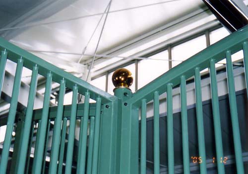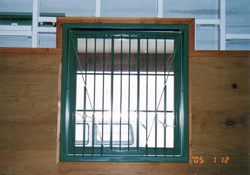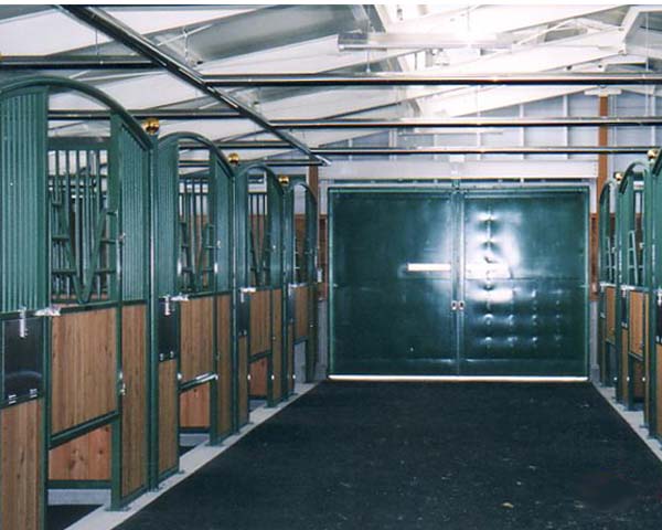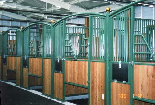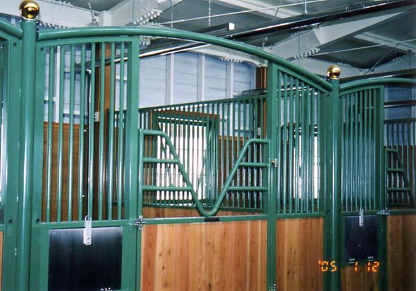 オリジナルデザインによる馬房パーティション。焼付塗装品。腰板はご当地特産の松材です。馬房パーティションは前面P/間仕切りP。オプション:可倒式飼い桶/デコレーション金球