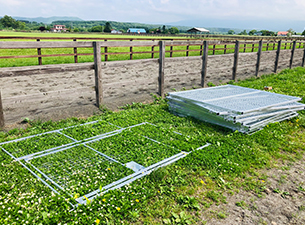 ジョイント組み立て式で不陸に強くお客様による設置も可能です。設置スピードの速さは施工費の節減に一役。隙間はゼロではありませんが、蹄が入らない寸法で設計してあります。 2025年版は高さ2000mmモデル