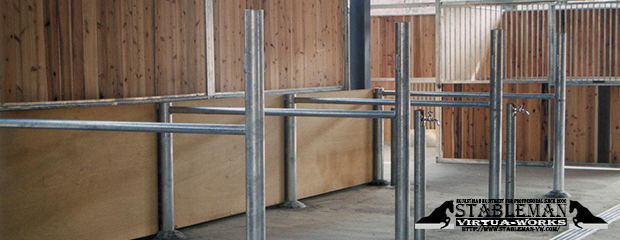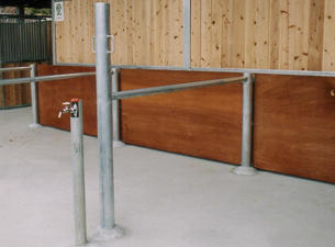 馬体を洗う際に便利なシャワーアームです。馬の脚にホースが巻き付いたり、踏まれたりしません。 またホースがすっきり収納できます。写真は蹄洗ポールへの取付例です。ホース、シャワーヘッド、ホースリールは市販品をご利用ください。