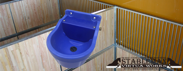 馬が水を飲むとフロートが下がり弁が開き水が供給され自動的に同じ水位を保ちます。 底の栓(黒)が取り外せて掃除する際に便利です。
