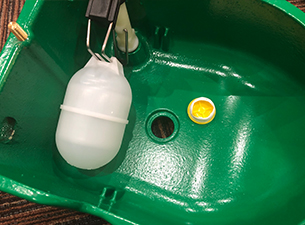 馬が水を飲むとフロートが下がり弁が開き水が供給され自動的に同じ水位を保ちます。 底の栓(黄)が取り外せて掃除する際に便利です。